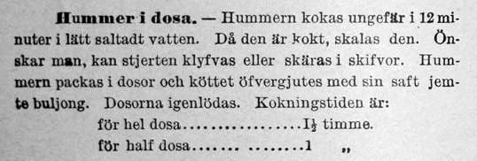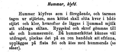 Jag har läst att förr i tiden var det vanligare att kustbefolkningen åt hummer som ett nödvändigt ont, och inte som nu, att det är dyrt och något man njuter av tillsammans med champange. Nej, förr var hummern som sagt mycket billigare. I det lustiga bokverket ”Praktisk Illustrerad KOK-BOK för Svenskarne i Amerika” utläses på sidan 109 under rubriken ”RÄTTER AF HUMMER”, att ”Alla kräftdjur måste lefvande komma i kokkärlet; om de när de fattas med händerna, ej draga stjerten kraftigt åt sig, äro de ej längre friska, utan hålla på att dö. Sådana exemplar bör ej köpas. De äro bäst i de månader som hafva r i namnet. Är mycket svårsmält föda och förorsaka ej sällan akut magkatarr. De böra endast förtäras af friska personer med god mage”.