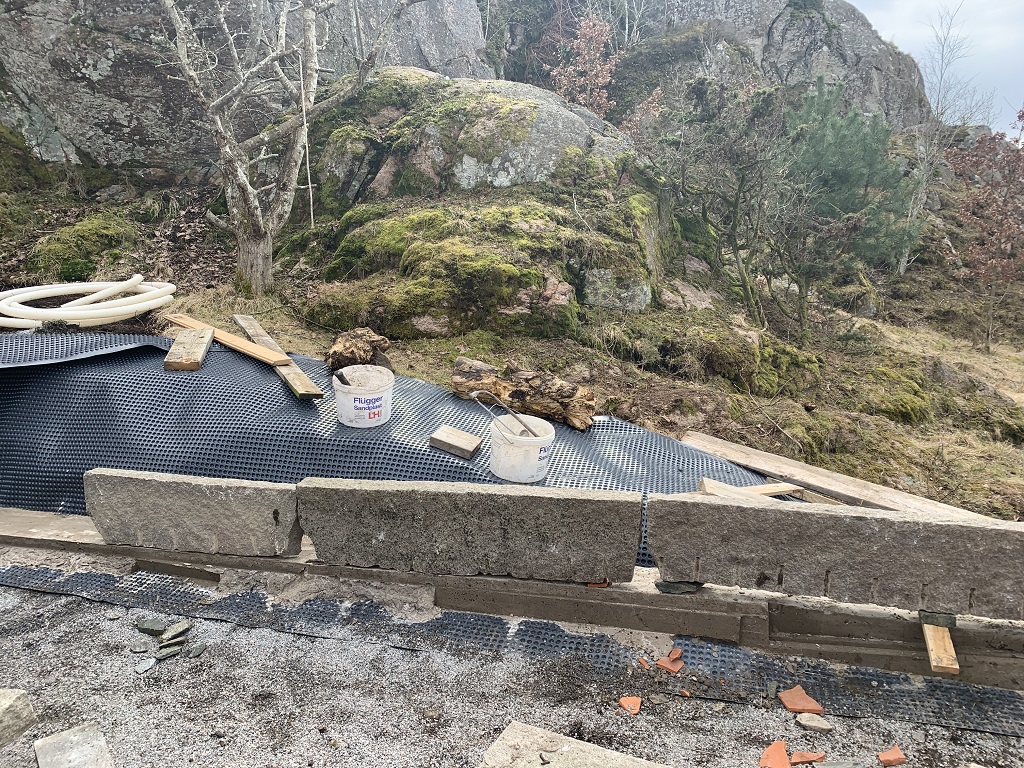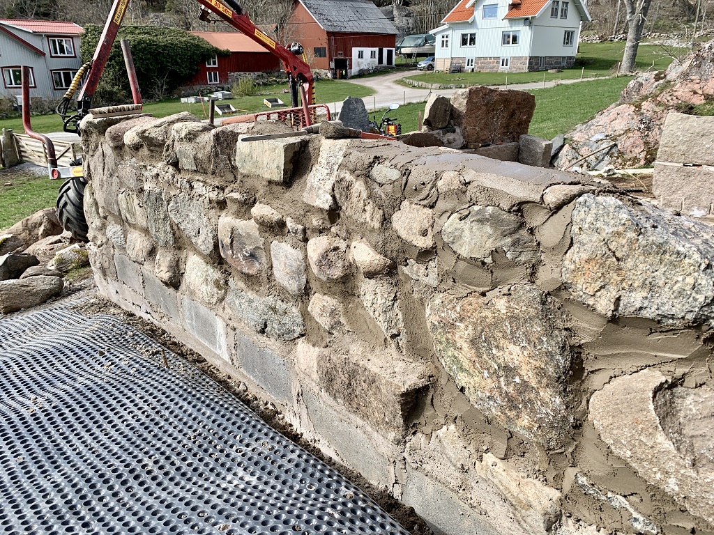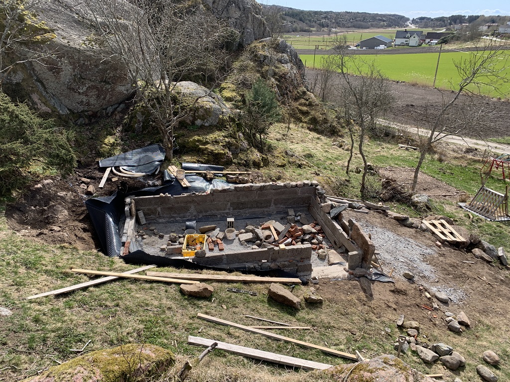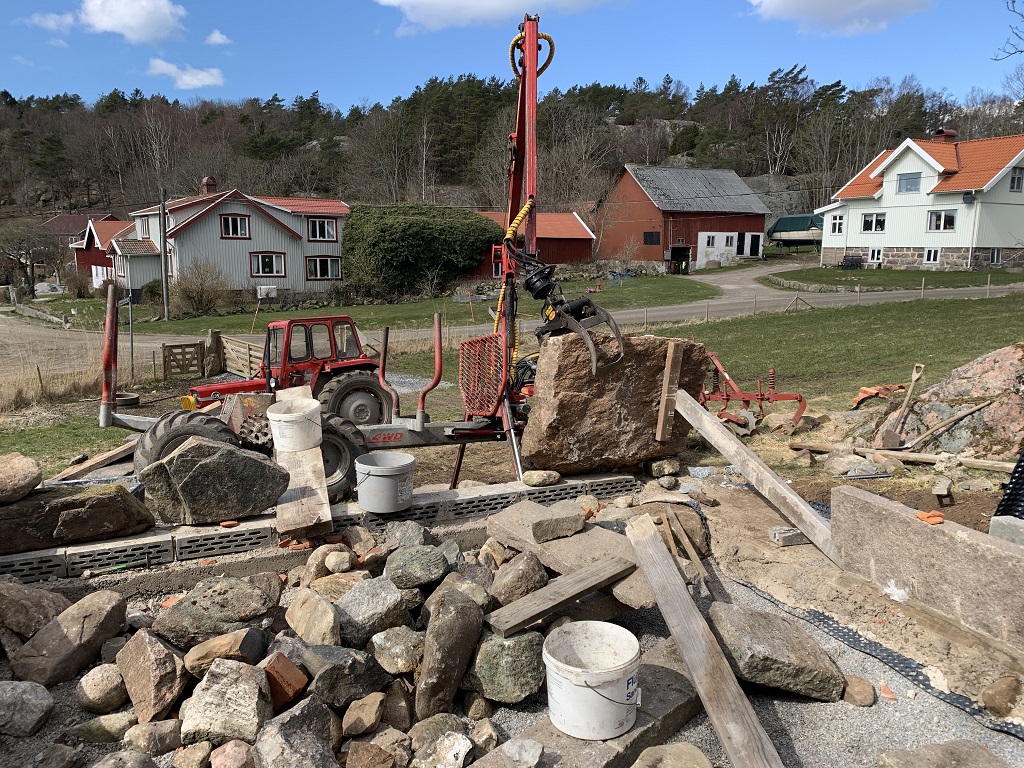 Det finns mycket man kan spara under kategorien ”Bra-att-ha”. Egentligen borde man kanske rensa och slänga mer på tippen än vad man gör, men i detta fall blev de gamla granitstenarna extra bra-att-ha. Stenarna kom från en granne som undrade om jag ville ha dessa, annars så skulle de just till soptippen. Och eftersom jag har en förkärlek till just sten, hämtade jag stenarna och lade dessa uppe i en hage tills vidare, eftersom jag ansåg det ekonomiskt fördelaktigt att ta tillvara. Någon gång skulle ju säkert dessa granitstoder komma till användning med sin blandning utav rödsprängda skrovliga yttre, robusta hårdhet och sin bohuslänska kärvhet. Efter att ha fixat till en bra grund att börja renoveringen från, medelst utgrävning och armerad betong, skulle det ju bli perfekt att använda graniten till en schwjill – Tjörbu’ för stenfot, husgrund. (Ex, ”-Dräb katta i schwjilla”.) Efter att ha fått till vinklarna på graniten var det lika bra att använda lite mera saker från förrådet ”Bra-att-ha”, och denna gången användes alla murblock för att förstärka ytterväggarna samt göra dessa tjockare.