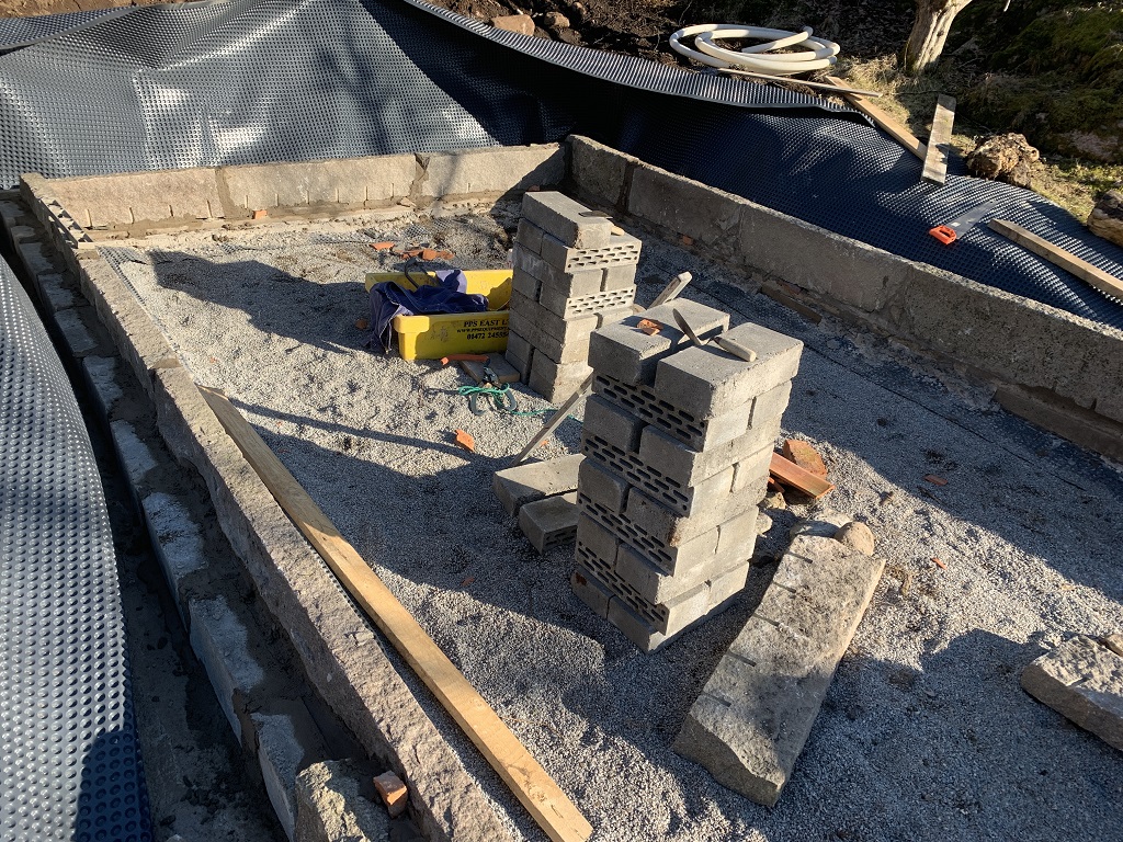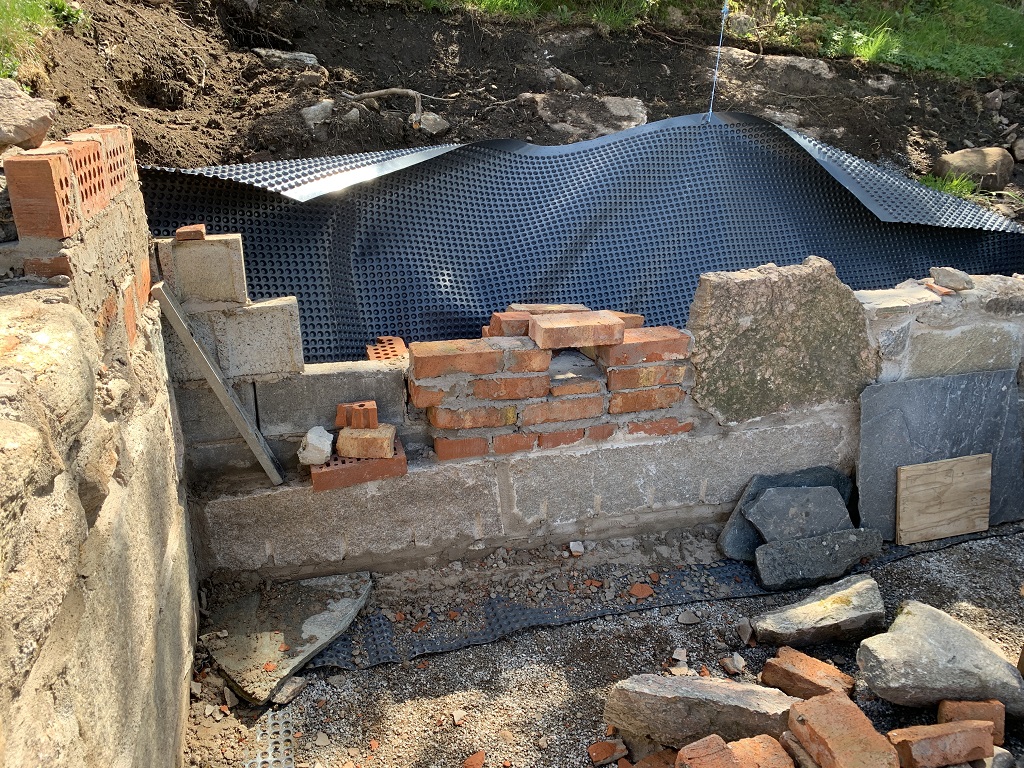 Under maj hände inte så mycket annat än att köra sten – både natursten och gammal tegelsten/eldfast sten från ”Bra-att-ha”-förrådet. Väggarna blev sakta högre. Vi skissade lite på fönster- och dörröppningar. Och bland det viktigaste – hur skulle skorstenen konstrueras?