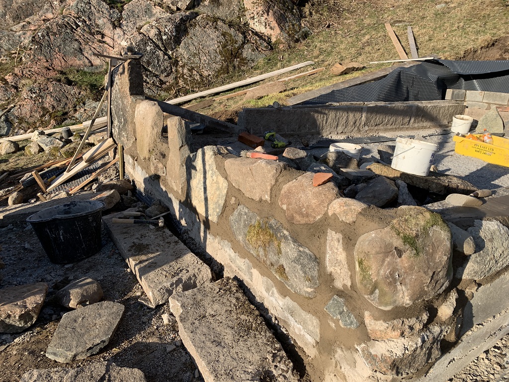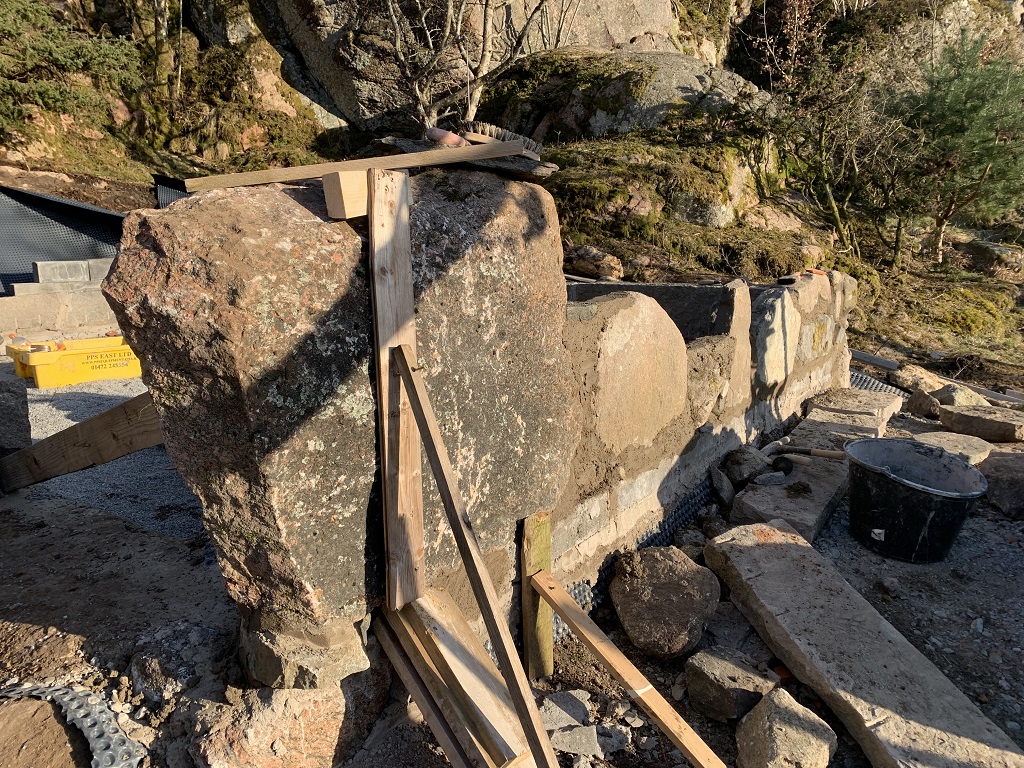 När första lagret med sten var fastmurat blev det lite enklare att bygga i någon form av förband. Samt att köra sten. Fruktansvärt mycket sten. Hela tiden. Och man fick gå och titta och fundera på vilka stenar som skulle passa var.