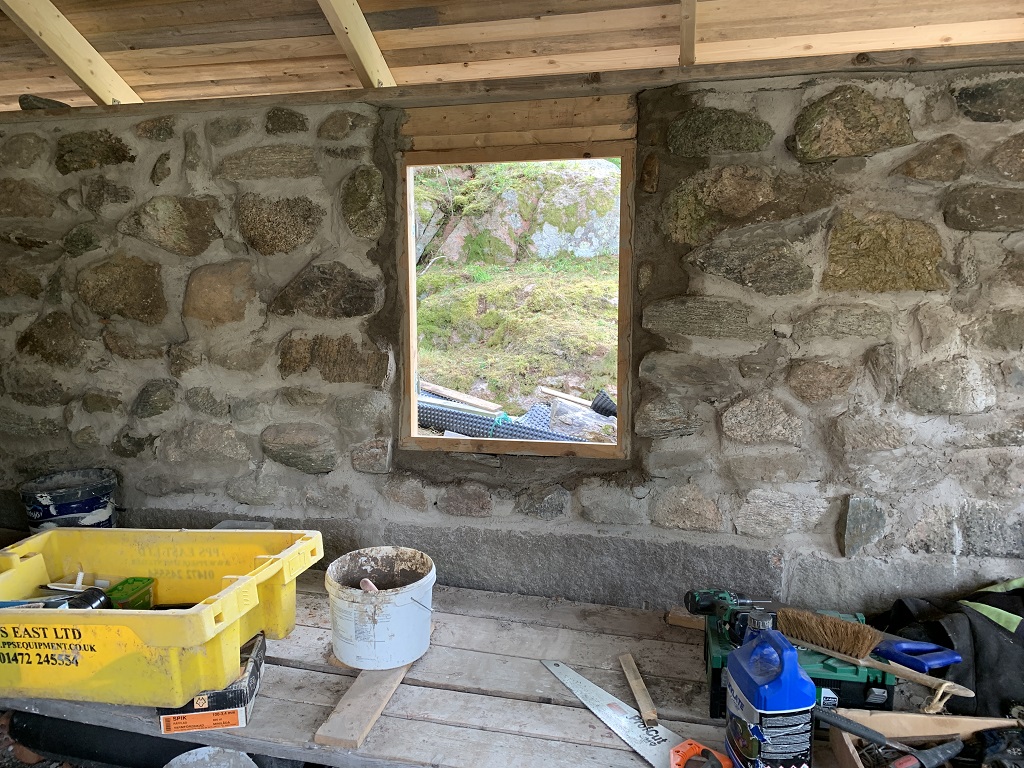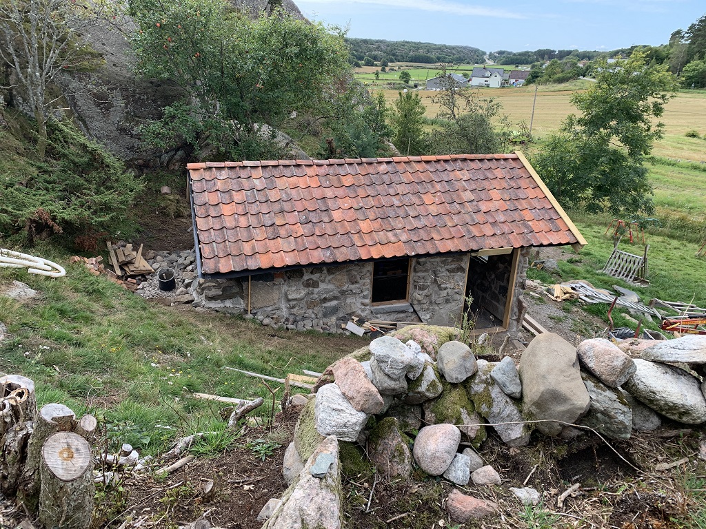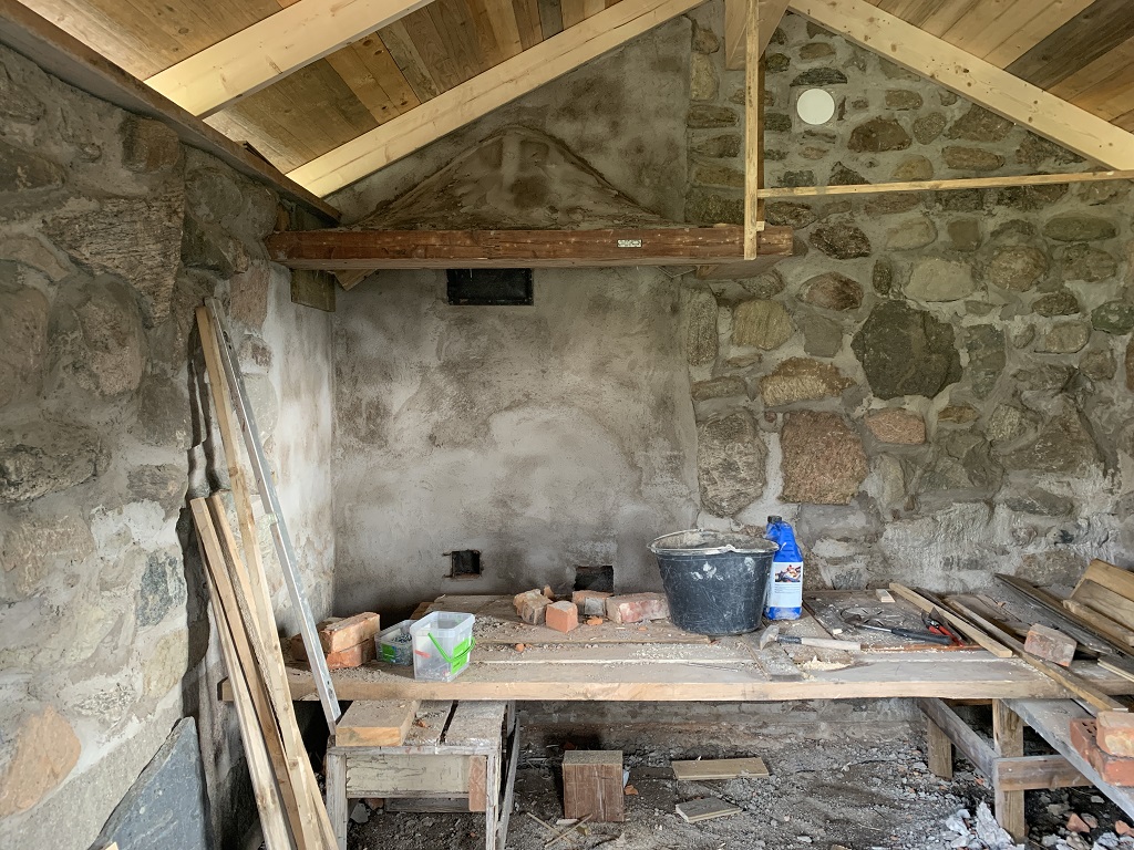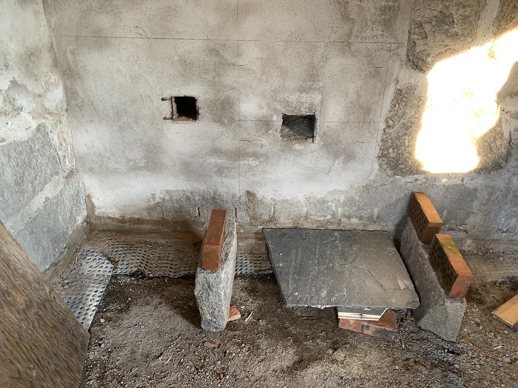 Det fanns gott om både begagnad fasadsten och begagnad eldfast tegelsten i gårdens bra-att-ha-hörne. Ihoppillat, samlat och sparat på genom årens lopp. På utsidan växte skorstenen sakta men säkert och vi behövde faktiskt inte köpa någon tegelsten alls. På insidan putsades skorstenen och det skissade med blyerts på putsen för att kunna ha några fasta punkter att gå efter gällande spisen och bänkskivans höjd från det ännu icke lagda golvet. En gammal spislucka murades fast mot den ena skorstenspipan för att kunna få lite fläktdrag och få ut eventuell osande rök, samt möjligheten att kunna elda i en öppen gruva rakt på bänken. Fönsterkarmarna fixades till och tätades och likadant gjordes mot dörrkarmen.
