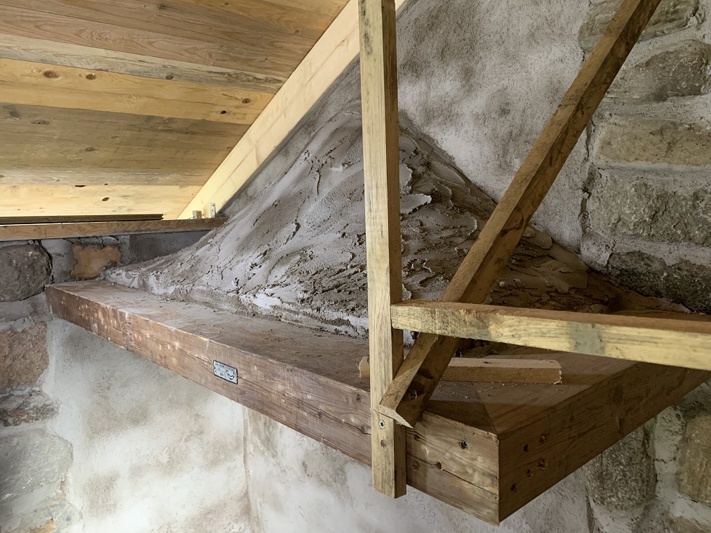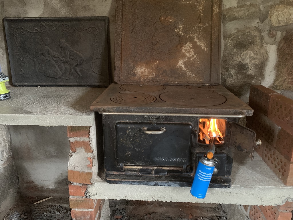 En träram för spiskåpan spikades ihop och kåpan murades med sten och putsades därefter. Som spismantel eller spiskåpe-mantel, användes en gammal brandklassad limträbalk som hittades i gårdens virkesförråd. Vi fann även två gamla sotluckor i gömmorna. En gammal spis från Ankarsum kånkades bort och monterades på prov. Det hade väl gått att använda denna, men det visade sig finnas rosthål lite här och var och den läckte lite för mycket rök.