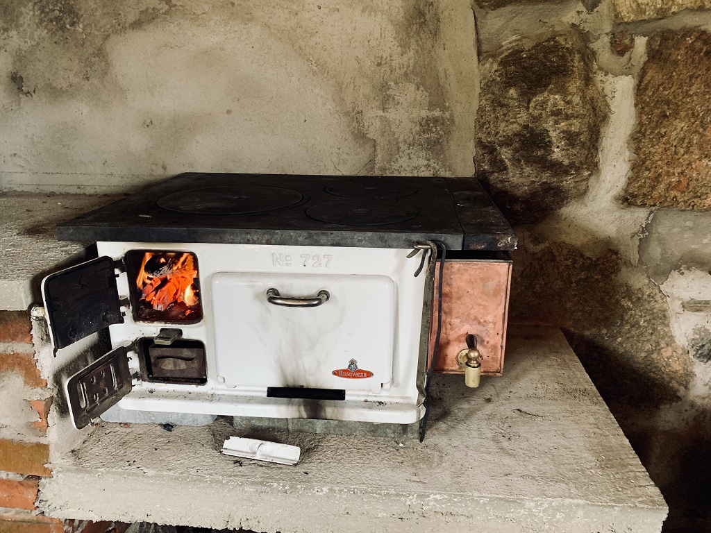 Av en slump hittades en fräsh (och ytterst billig) vedspis från Husqvarna, modell 727 (samma modell som Norrahammar 727). Detta borde vara den allra vanligaste vedspisen som finns i våra svenska stugor. Spisen har tre stycken plattor och just denna har emaljerad front i vitt, vilket är lite ovanligare än det klassiska svarta gjutjärnet. Anslutningsmöjligheterna finns både bak- eller upptill men i stugan blir anslutningen bak, rakt in i skorstenen. En liten behändig spis, med måtten bredd 54 cm, djup 52 cm och höjd 32 cm, varav hällmåttet är 63 x 52 cm. Även varmvattenkärlet i koppar, med tappkran, följde med, samt asklåda och två spiskrokar.