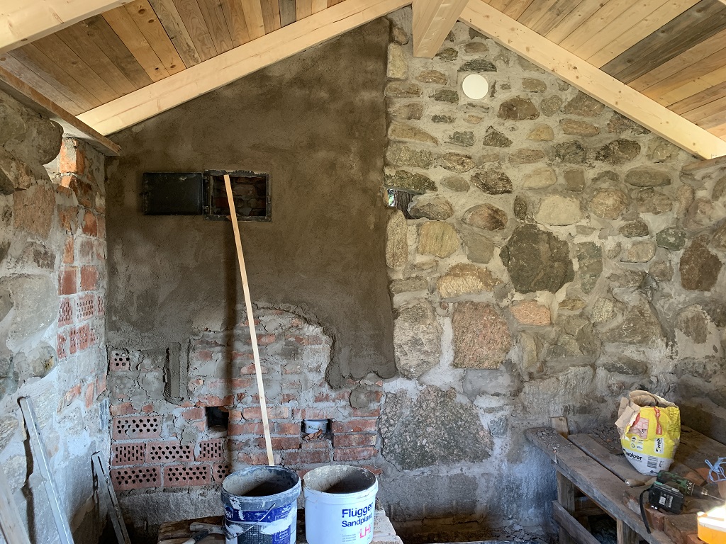 Det fanns gott om både begagnad fasadsten och begagnad eldfast tegelsten i gårdens bra-att-ha-hörne. Ihoppillat, samlat och sparat på genom årens lopp. På utsidan växte skorstenen sakta men säkert och vi behövde faktiskt inte köpa någon tegelsten alls. På insidan putsades skorstenen och det skissade med blyerts på putsen för att kunna ha några fasta punkter att gå efter gällande spisen och bänkskivans höjd från det ännu icke lagda golvet. En gammal spislucka murades fast mot den ena skorstenspipan för att kunna få lite fläktdrag och få ut eventuell osande rök, samt möjligheten att kunna elda i en öppen gruva rakt på bänken. Fönsterkarmarna fixades till och tätades och likadant gjordes mot dörrkarmen.