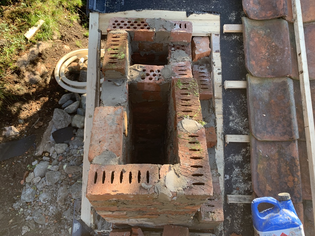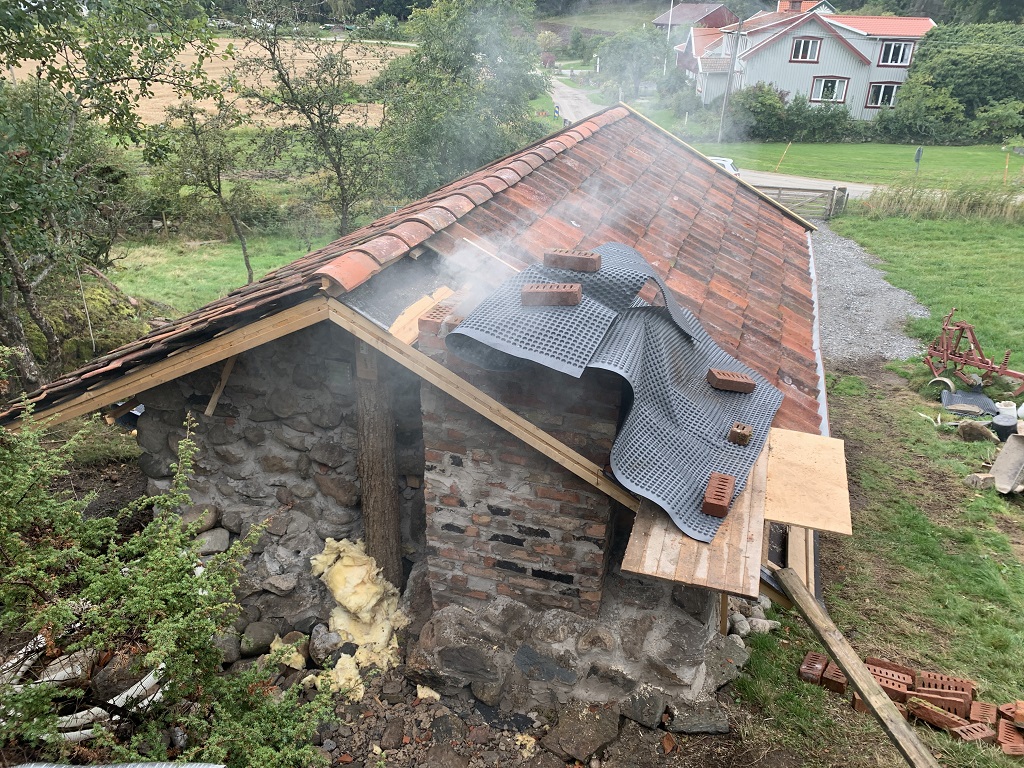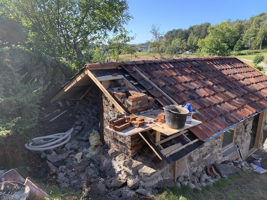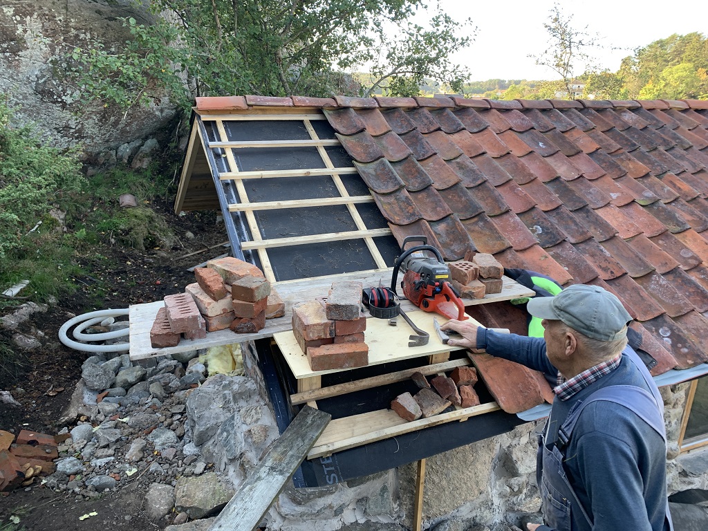 Taket sågades upp och skorstenen murades upp genom hålet.