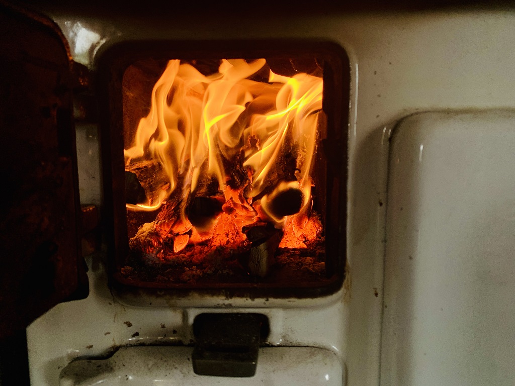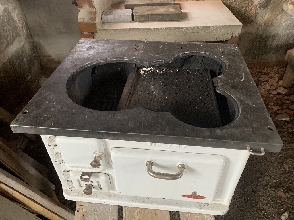 Av en slump hittades en fräsh (och ytterst billig) vedspis från Husqvarna, modell 727 (samma modell som Norrahammar 727). Detta borde vara den allra vanligaste vedspisen som finns i våra svenska stugor. Spisen har tre stycken plattor och just denna har emaljerad front i vitt, vilket är lite ovanligare än det klassiska svarta gjutjärnet. Anslutningsmöjligheterna finns både bak- eller upptill men i stugan blir anslutningen bak, rakt in i skorstenen. En liten behändig spis, med måtten bredd 54 cm, djup 52 cm och höjd 32 cm, varav hällmåttet är 63 x 52 cm. Även varmvattenkärlet i koppar, med tappkran, följde med, samt asklåda och två spiskrokar.