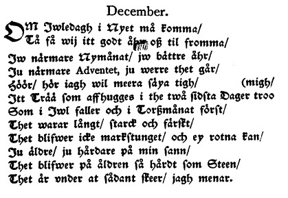 Det är inte alltid lätt att förstå gammelswenska, därför har jag översatt ovanstående text till nutida svenska. Inte för att det blev speciellt lättare att begripa, men ett tips är att läsa högt för sig själv och samtidigt reflektera över hur folket tänkte och resonerade förr i tiden, gällande att hitta någon slags orsak till varför vädret blev som det blev, och hur det skulle komma att bli. December är den månad som har flest förutsägelser och noteringar i Bondepraktikan, mycket beroende på de kristna högtiderna, och att det blir ett nytt år efter december.