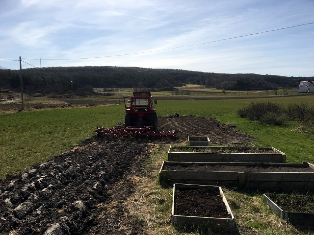Jag började med att pröva den nya harven. Det gick mycket bra och det behövdes endast fyra drag innan molla‘ var slät som en barnrumpa. Nästa steg var att koppla på potäterläggar’n och hämta potatisen.