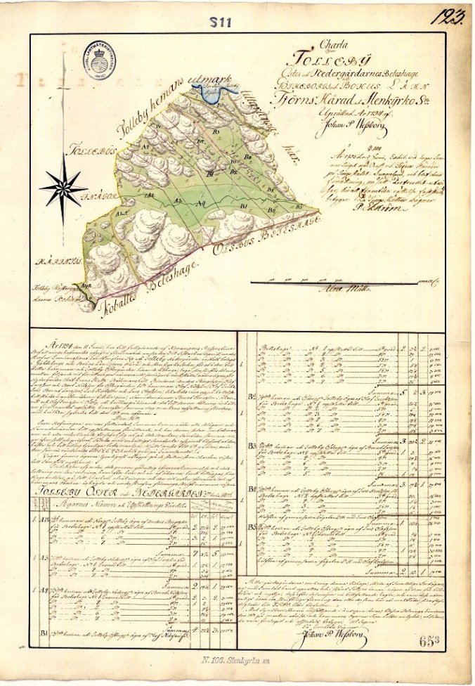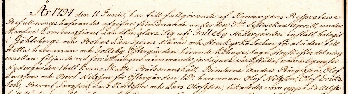 ”År 1794 den 11 Juni, har till fullgörande af Konungens Representative Befallningshafvandes afgifvne förordnande under den 3dje [oläsbart] aprill, under kvefne Commistisjions Lantmätare sig uti Tolleby Nedergården [oläsbart] belagd uti Götheborgs och Bohus Län Tjörns Härad och Stenkyrko Sockn för af å den till detta hemma och Tolleby Öfvergården hörande Kohage, laga storskiftesdelning emellan följande vid förrättningen närsvarande jordägare …fälla, nämnligen för Nedergården 1 helt krono Skatte Båtsmanshåll,…”
