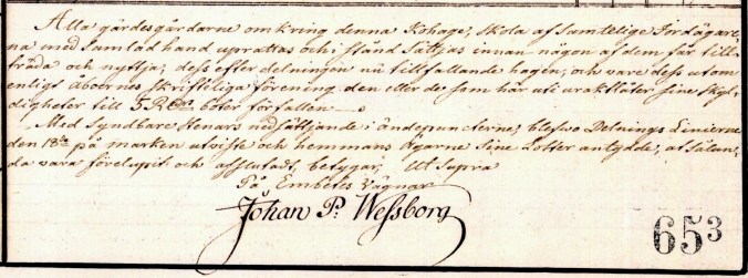 …”Alla gärdesgårdarne omkring denna Kohage, skola af samtelige Jordägarena med samlad hand upprättas och i Stånd Sättjas innan någon af dem far tillträda och nyttja, dels efter delningen nu tillfallande hagen, och vare dels utom enligt åboernas skrifteliga förening den eller de som här ute undanlåter sina skyldigheter till 5 Riksdaler böter förfallen…”