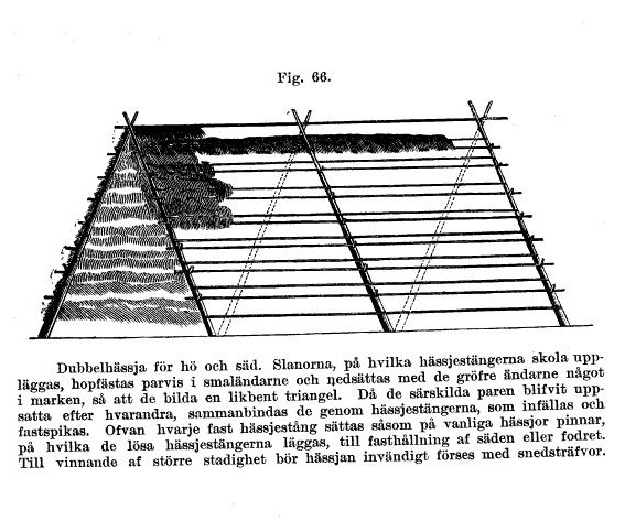 Klöfverhöet Upphänges på hässjor i fullkomligt färskt tillstånd, men får icke vara regn- eller daggvått, ty i så fall möglar det. Hässjorna göras antingen af stänger, hvilande på »hässjestolpar» eller linor, snodda om och spända mellan störar. Stånghässjorna kunna göras antingen dubbla eller enkla. Fig. 66 visar en stånghässja med dubbla stolprader och fig. 67 visar en linhässja.