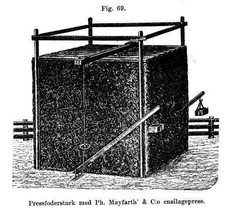 Då mekaniska pressar användas vid ensilageberedningen, måste man noga tillse, att linorna ständigt äro spända, på det att öfverhettning ej skall uppstå. Temperaturen kontrolleras genom särskildt kontrollerade stacktermometrar. – En del af dessa pressar (se fig. 69) äro själfverkande, hvilket naturligtvis innebär en stor fördel vid deras användning. – Genom att noga tillse linorna, d. v. s. att allt emellanåt förnya tillpressningarne, blir fodermassan allt mer och mer kompakt. Luftens syre får ej tillträde till stackens inre; all förbränning förhindras och fodret konserveras. De Rainstedtska pressfoderbäddarne läggas alltid cylindriska.
