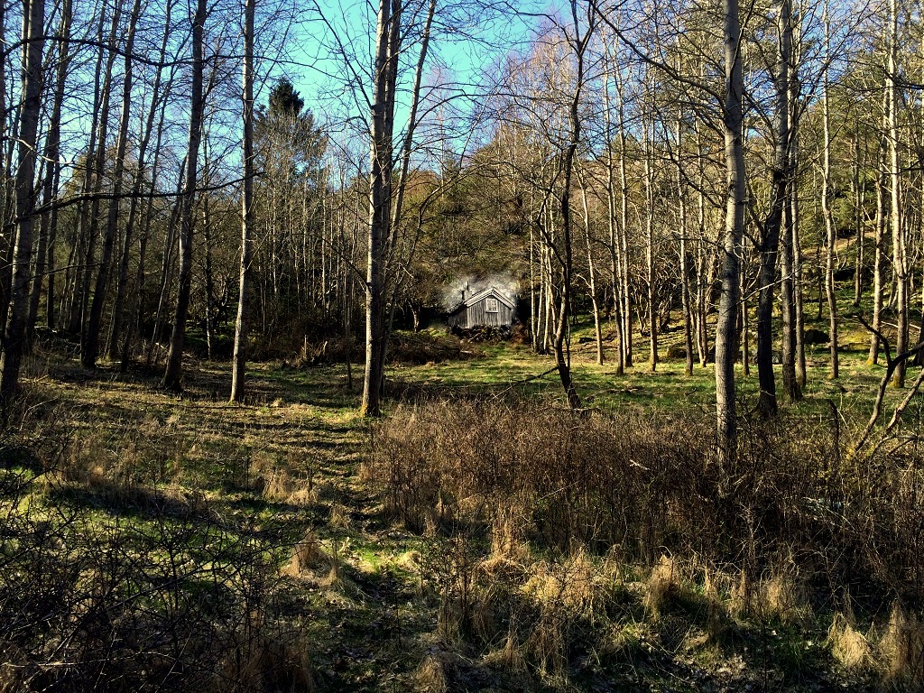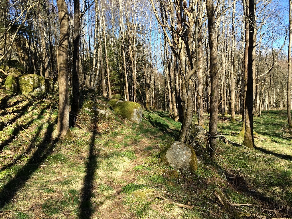 Så här såg det ut den 23’e april år 2016 när jag, Christine, Wiggo, Elin, Holger, mamma, Henrik och Ann-Marie tog en promenad. Stugan låg rakt fram där björkarna nu står.