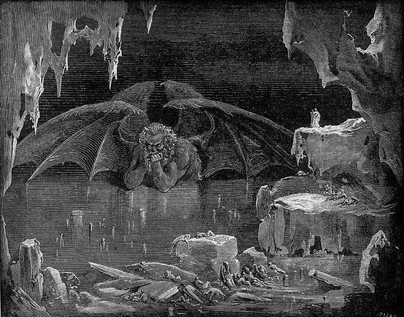 Ur Dantes ”Den gudomliga komedin” – ”Synlig från bröstets mitt och uppåt stod där i isen kejsaren i kvalens rike” (Helvetet XXXIV). Gravyr av Gustave Doré.