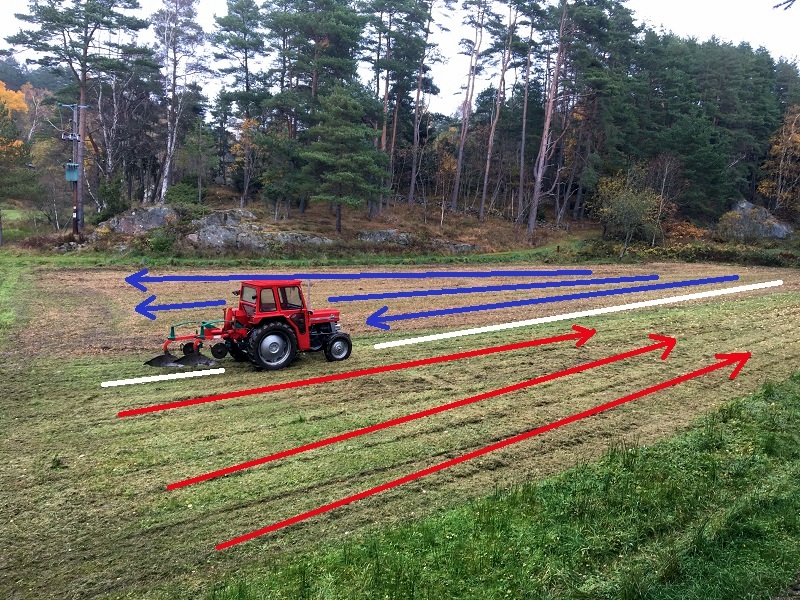 I med att åkern i exemplet är liten så plöjde jag ett drag, backade tillbaka, plöjde ett nytt drag, backade tillbaka och så vidare, tills allt var plöjt. Detta för att slippa en slutfåra – far – mitt i åkern.