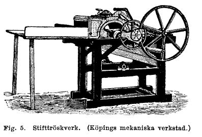 »Slagtröskverk», hvilkas konstruktion i sin enklaste form uppfanns 1785 af skotten A.Meikle och hvars tunna har 4-8 upphöjda släta eller räfflade slaglister, liksom äfven skon är försedd med sådana, samt »stifttröskverk» har tunnan och ofta äfven skon besatta med framskjiutande järnstift. Hos nutida slagtröskverk utgöres tunnan oftast och stundom äfven hos stiftverken ej af en sluten cylinder, utan af på en gemensam axel sittande ringar eller hjul, vid hvilka slagor med slaglister eller stift äro fästa….Eftersom tröskverken mer eller mindre fullständigats med anordningar för halmens afskiljande och sädens rensning, skiljer man mellan 1) enkla verk utan dylika anordningar; dessa äro vanligen stiftverk med 25 – 35 cm. lång slagtunna, lämna säden blandad med halmen, agnarna och bosset, som sedan afskiljas, halmen med gaffel, agnar och boss med rissel och kastmaskin; de drifwas för hand eller mest med vandring eller motor.