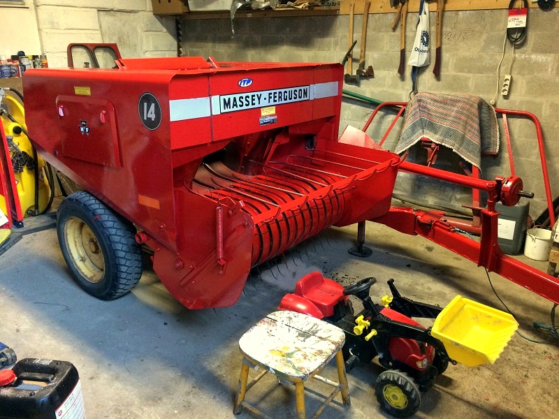 Första steget (efter inköp) var att riva ner pressen lite lätt för att sedan slipa rost. Det tog nästan en vecka men sedan var pressen klar. Det korrekta namnet är egentligen Massey Fergusson Medium Halmpress, men de flesta säger MF 14 mediumpress. Och har den till både hö och halm. En mediumpress hamnar mittemellan en löspress och en hårdpress. Löspressen är oftast ett stort spektakel till maskin som pressar lösa kuddar med hö. Medans mediumpressen egentligen skulle kunna betecknas som en hårdpress, i med att man kan ställa balarna att bli hårt pressade, förutom att mediumpressen saknar knivar i pressen, vilket hårdpressen har. Knivarna i en hårdpress skär sönder höet innan det packas, medans i en lös- och mediumpress, går höet rätt igenom.