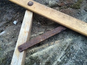 Det gick inte att köra så mycket längre, duken krånglade. Jag ställde upp nekarna, hade först tänkt att trä dem på hässje-stolpar, men det var sent på kvällen etc etc. Väl tillbaka på gården kollade jag stropparna som höll ihop duken. De satt kvar som de skulle. Till och med original-gummibandet (det enda som höll) satt kvar.Jag ska försöka laga duken. Limma, sy och förstärka med ny duk och öljetter? Dukens bredd är mellan 115 – 116 cm. Genomsnitt 115,5 cm. Dukens längd är ungefär 290 – 291 cm.