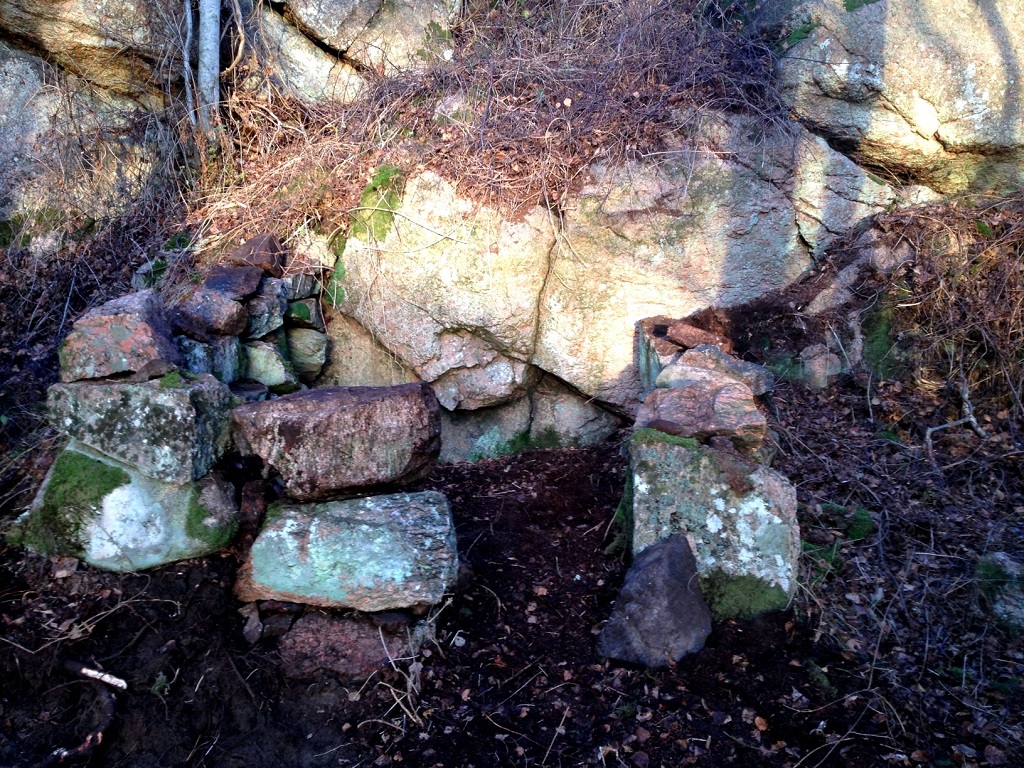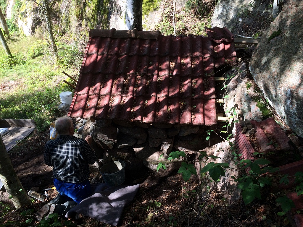 En dag på hösten 2013 gick jag och Holger helt sonika ner och började gräva ut jord, löv, grenar och annat gammalt bös som legat i ruinen och gottat sig de senaste hundra åren. Vi reste upp väggarna och murade en del. Grundstenarna hade sjunkit ner i jorden och fick grävas fram. Det var minst sagt tungt arbete.