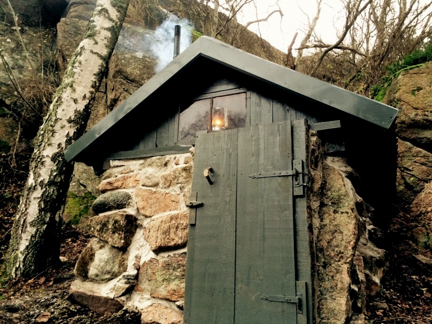 Under 2014 fick vi mer tid att åtgärda sö-huset. Vi murade och fogade ihop stenarna bättre, vi gjöt med betong för att få ordentlig stadga och täthet. Vi satte in en kamin så att Tomten skulle hålla sig varm nästa julafton. Vi spikade ihop en dörr och satte in ett fönster. Sista handen lades på hösten då sö-huset fick vindskivor och målades ett par gånger i stengrå kulör. Under sommaren tillbringades en hel del tid på knä med att klena bruk på väggarna. Ett fel med dagens moderna bruk är att de ofta är ljusa i färgen. En aning för ljusa. Men det mörknar väl med tiden.
