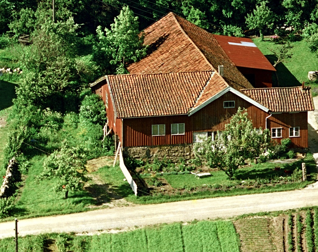 Lagårn 1971. Vid det vita staketet som avgränsar köksträdgården, ligger vid den öfvre änden mot stenfoten av natursten, gårdens dyngesta’ eller gödselstad. Gödseln ligger under tak och man lasta ur med traktor utan att behöva öppna några portar. Bakom de två fönstergluggarna ovanför stenfoten av natursten, ligger ett av gårdens två hönshus. Det nya stallet är ännu inte byggt längst västra gaveln, utan under den stora flädern som står och trycker längst väggen ligger vagnslidret, som senare byggdes ut till ett nytt stall.