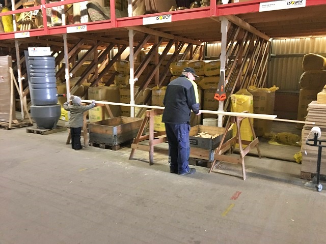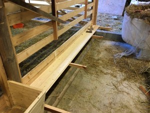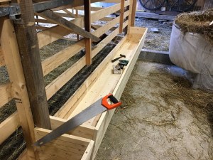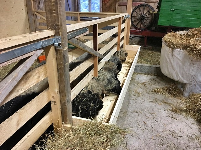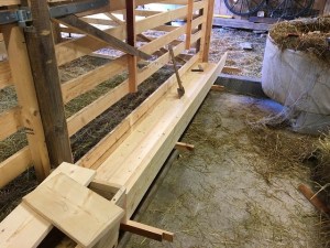 Förhoppningsvis har baggen gjort sitt jobb, så att tackorna är dräktiga och föder lamm i april-maj. Eftersom den första krubban (foderbordet) med god marginal uppfyller Jordbruksverkets minimimått för rakt foderbord vid samtidigt utfordring på 0,45 m per djur, beslöt vi att bygga ett foderbord till i samma stil, med tanke på den eventuella utökningen av fårskocken. Jag och Elin körde till brä’gårn med traktor och kärra och Holger mötte upp med bilen. (Wiggo och Christine hjälpte under tiden grannen att rulla ihop ett par kilometer med stängseltråd).