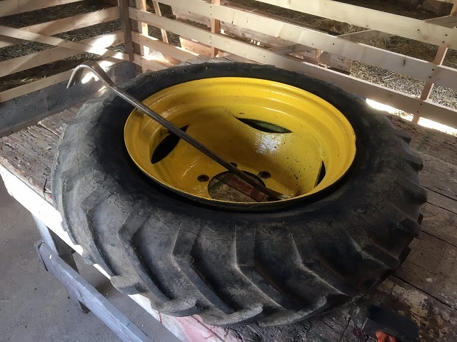 det ena däcket hade smygpunka och det andra däcket led av kraftiga torrsprickor. Sagt och gjort, ett par nya däck beställdes och levererades. Eftersom spridaren är från 1950-talet har de gamla härliga hjul med slang i. Fram med däckjärn, kofot, slägga, såpa, ett rejält ordförråd av kraftuttryck, spotta i näven och sätta igång. Det underlättar såklart om man är två personer. Däcken är av dimensionen 7.50-20, vilket betyder att däcket mäter 205 mm i bredd, 915 mm i diameter och klarar en belastning av 1000 kg i 30 km/h.