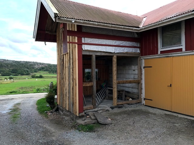 Då ska vi se hur det har gått med projektet att bygga om gårdens »koghus» (kokhus/brygghus). Vi har rivit ner väggarna och rivit ner stenfoten samt två golv, byggt upp allt igen och öppnat upp emot ladan. Det är märkligt hur mycket rymligare uppfarten känns, ändå har vi bara kortat byggnaden med 60 centimeter.