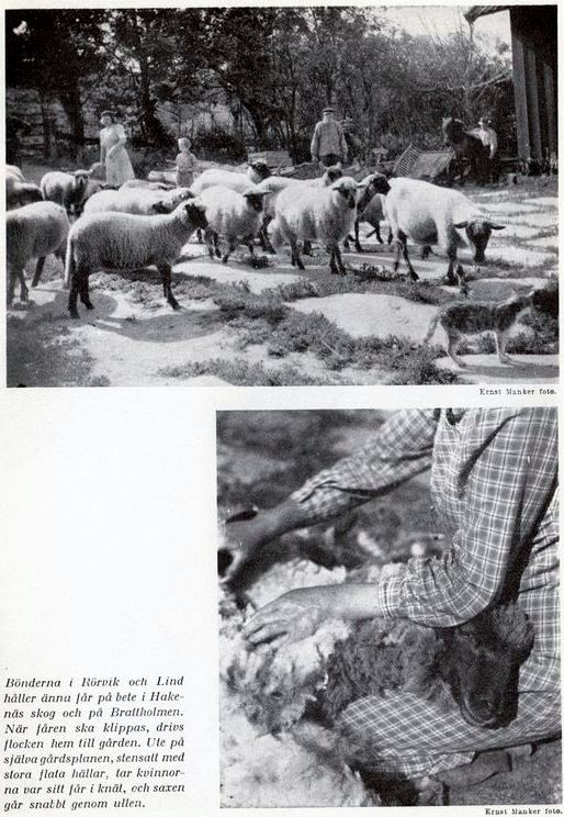 Bönderna i Borvik och Lind haller ännu får på bete i Hakenäs skog och på Brallholmen. När fåren ska klippas, drivs flocken hem till gården. Vte på själva gårdsplanen, stensatt med stora flata hällar, lar kvinnorna var sitt får i knät, och saxen går snabbt genom ullen.