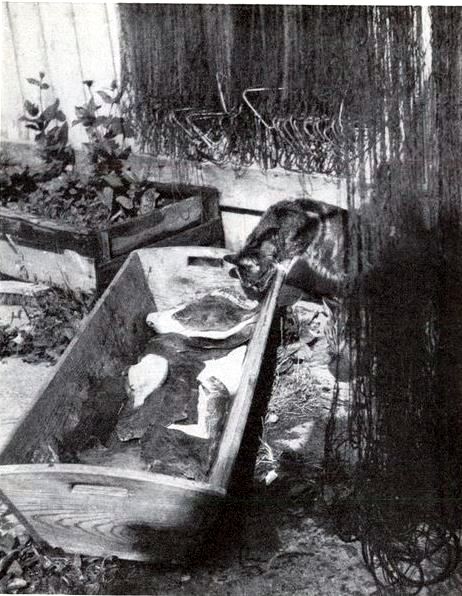 Bönderna på Hakenäs fiskar till husbehov. Här har garnen splillats, och i Iråget spritter dagens färska fångst. — När fiskaren vänder ryggen till, håller sig katten framme.
