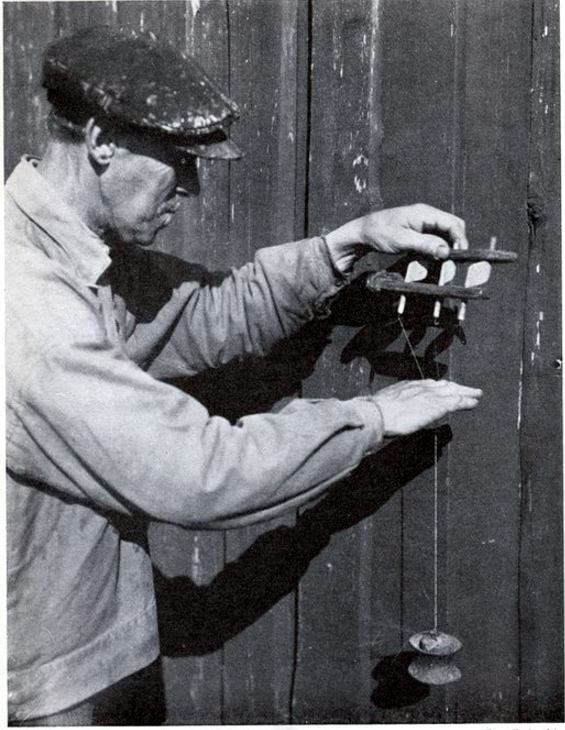 Karl i Hasselkroken både snodde dörjelinor och satt ute på sjön och dörjade vitling. Och vi följdes åt ibland. Bara att se honom ta agn ur »skalen», blåmusslorna, var en fröjd — mitt ovana knevlande hade han kanske lika roligt åt. Med ett ritsch klöv Karls kniv musslan och ratsch ratsch skrapade den blötdjuret ur de båda halvorna, och så smäcktes den lilla slemklicken på toften framför oss. Skal efter skal tömdes och hopen av agn räckte snart en stund för oss bägge. Dörjens båda krokar agnades; kroken snoddes ett par varv genom blötdjurets lösare delar och stacks så in i »knappen», den lilla muskulösa foten, där hullingen fick fäste. Och linen löpte över hornet mot bottnen på åtskilliga famnars djup. Det där hornet, ett elegant svängt kohorn på ett skaft i ett av tollehålen, kom jag ihåg från barnaårens fisketurer: linan löpte så lätt över hornets glatta rundning, att man förnam minsta napp utan att behöva hålla handen över båtkanten; i hornspetsen fanns också en skåra, där man kunde klämma fast linan, i händelse man måste släppa den för ett ögonblick.