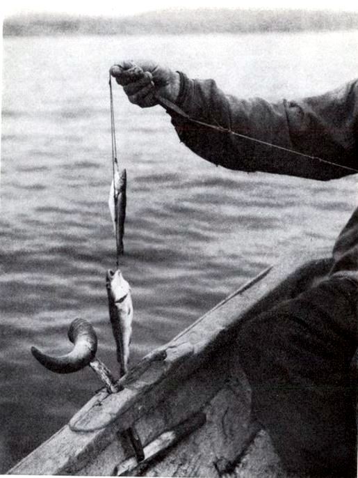 På kvällarna ligger man ute och dörjar viiting och torsk. Den hemspunna dörjelinan av tagel löper över ett kohorn, och vill det sig väl, har man napp på bägge krokarna.